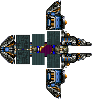 Ten wielki statek wylatuje przeważnie z lewej strony ekranu, rozdzielony na dwie części. Jedna leci dołem a druga górą. Kiedy dotrą na środek ekranu, z impetem scalają się w widoczny na obrazku okaz. Wrażliwe oko ma sprytnie schowane w środku. Każda połówka ma swoje. Na tego wroga bardzo przydaje się strzelanie "Vertical".